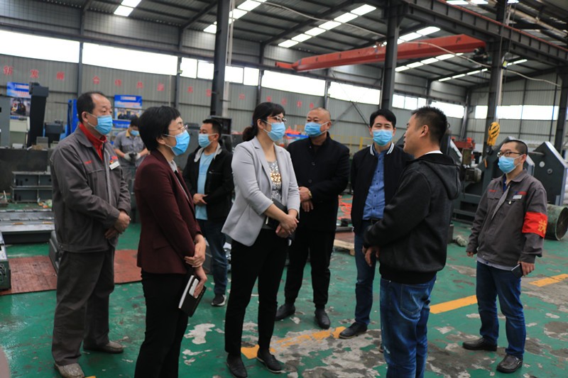 逯明書記一行首先來到了生產車間,現場考察企業在常態化疫情防控下的復工復產情況和面臨的困難。在裝配調試區,逯書記詳細了解了一拖二全自動口罩機、高速數控角鋼鉆孔生產線、新型高速數控角鋼沖孔打字剪切生產線等設備的裝配調試情況和生產過程中遇到的困難。